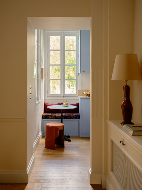 Decor elements combine Italian design with travel-inspired, particularly Asian influences, mirroring the owners’ experiences. Ceramics by Marie Saint Bris and photographs by Carmen Bouyer adorn the living room. A triglyph frieze and Doric columns, crafted by a skilled French plaster artisan, frame the main living area.